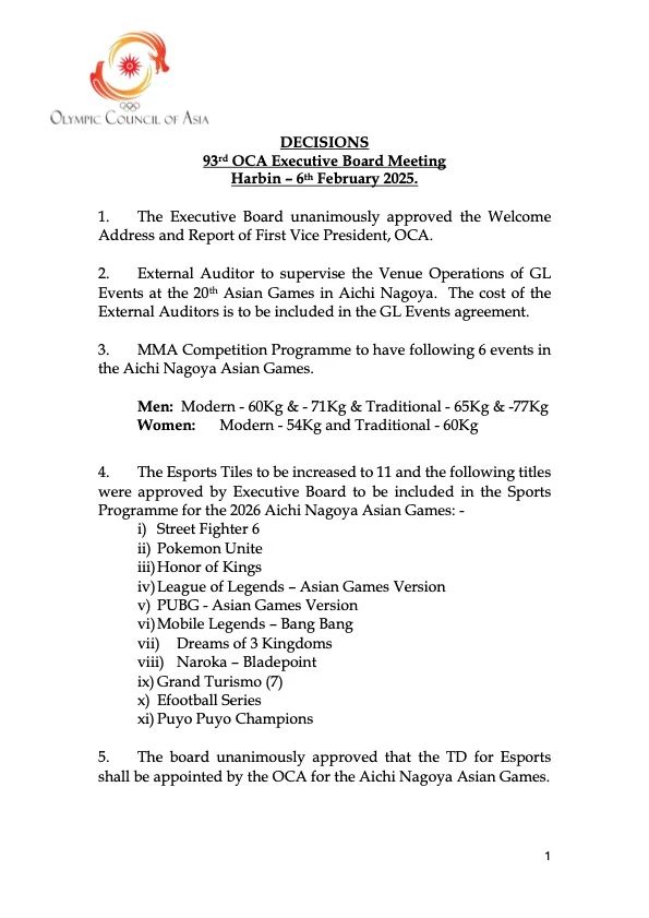 委員會還一致決定解散由OCA任命的、負(fù)責(zé)確定2026年愛知名古屋亞洲運(yùn)動會電子競技項(xiàng)目的工作組(Task Force),因?yàn)殡娮痈偧柬?xiàng)目已由OCA執(zhí)行委員會批準(zhǔn)。